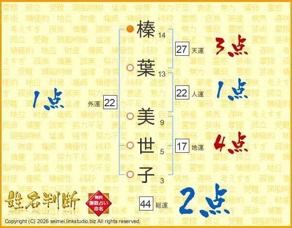 榛(14画)葉(13画) 美(9画)世(5画)子(3画)