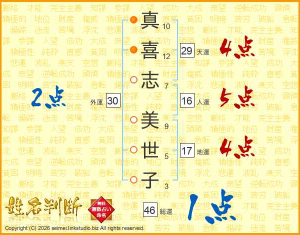 真(10画)喜(12画)志(7画) 美(9画)世(5画)子(3画)