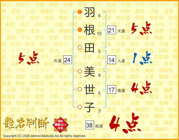 羽(6画)根(10画)田(5画) 美(9画)世(5画)子(3画)