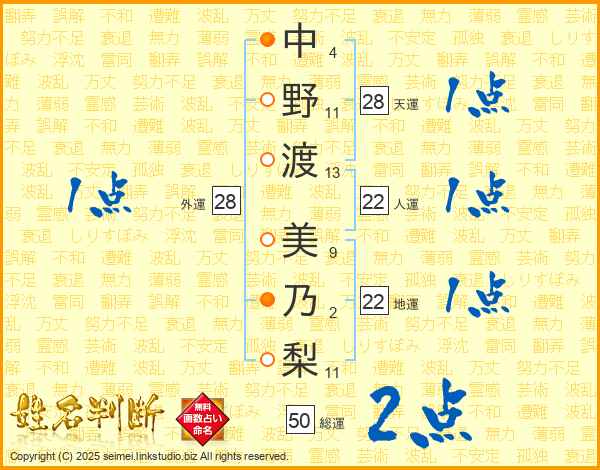 中(4画)野(11画)渡(13画) 美(9画)乃(2画)梨(11画)