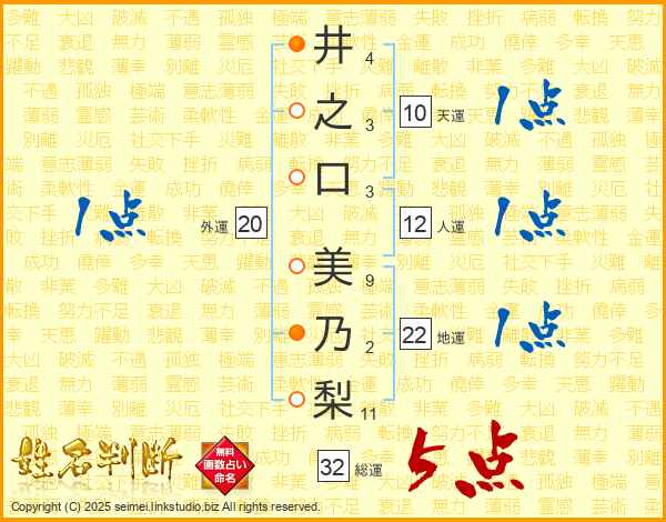 井(4画)之(3画)口(3画) 美(9画)乃(2画)梨(11画)