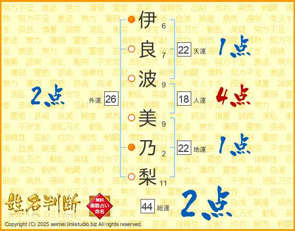伊(6画)良(7画)波(9画) 美(9画)乃(2画)梨(11画)