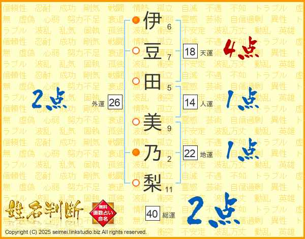伊(6画)豆(7画)田(5画) 美(9画)乃(2画)梨(11画)