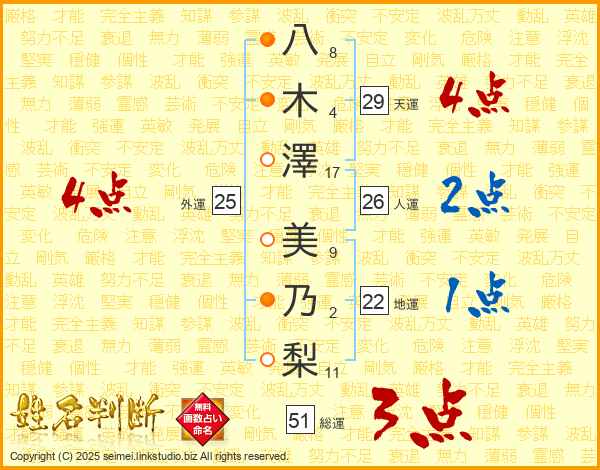八(8画)木(4画)澤(17画) 美(9画)乃(2画)梨(11画)