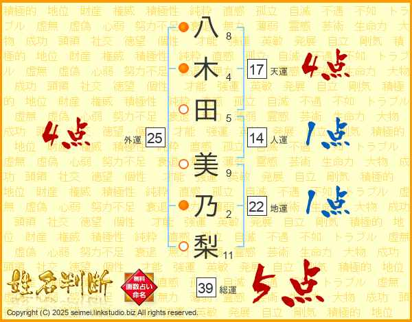 八(8画)木(4画)田(5画) 美(9画)乃(2画)梨(11画)