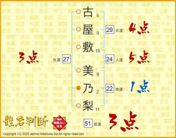 古屋敷美乃梨さんの総運は51画の3点!