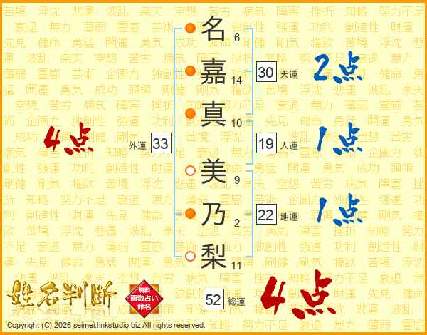 名(6画)嘉(14画)真(10画) 美(9画)乃(2画)梨(11画)