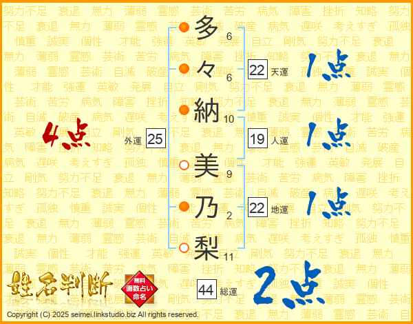 多(6画)々(6画)納(10画) 美(9画)乃(2画)梨(11画)