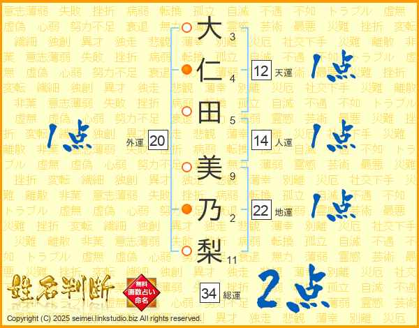 大(3画)仁(4画)田(5画) 美(9画)乃(2画)梨(11画)