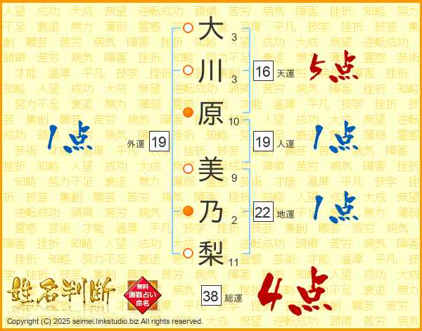 大(3画)川(3画)原(10画) 美(9画)乃(2画)梨(11画)
