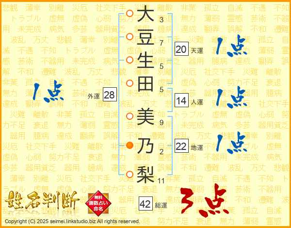 大(3画)豆(7画)生(5画)田(5画) 美(9画)乃(2画)梨(11画)