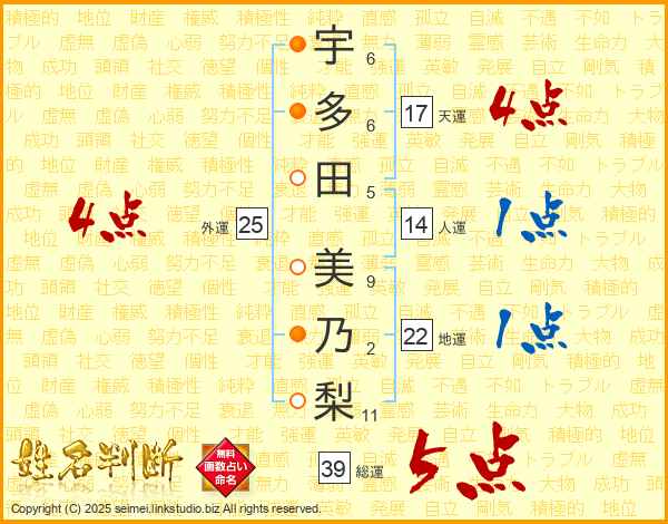 宇(6画)多(6画)田(5画) 美(9画)乃(2画)梨(11画)
