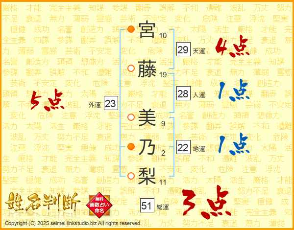 宮(10画)藤(19画) 美(9画)乃(2画)梨(11画)