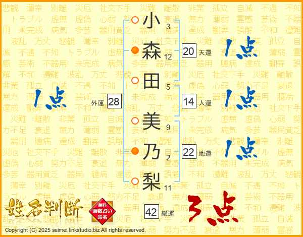 小(3画)森(12画)田(5画) 美(9画)乃(2画)梨(11画)