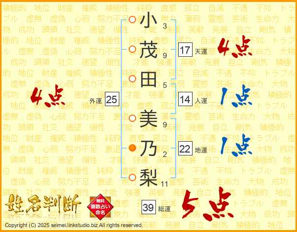 小(3画)茂(9画)田(5画) 美(9画)乃(2画)梨(11画)