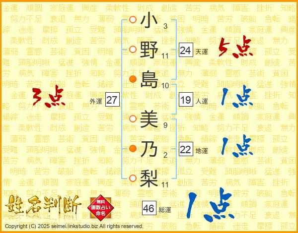 小(3画)野(11画)島(10画) 美(9画)乃(2画)梨(11画)