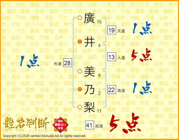 廣(15画)井(4画) 美(9画)乃(2画)梨(11画)