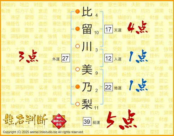 比留川美乃梨さんの総運は39画の5点!
