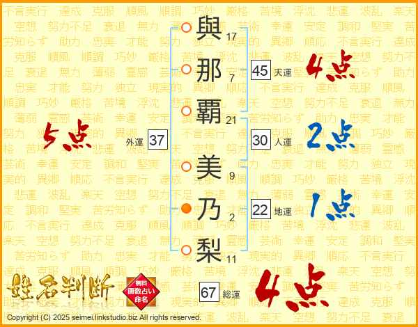 與(17画)那(7画)覇(21画) 美(9画)乃(2画)梨(11画)