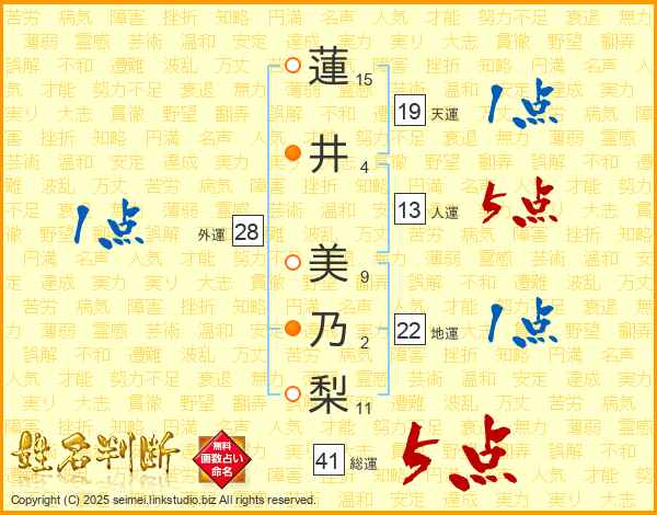 蓮(15画)井(4画) 美(9画)乃(2画)梨(11画)