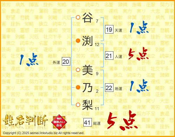 谷(7画)渕(12画) 美(9画)乃(2画)梨(11画)