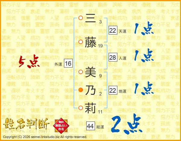 三(3画)藤(19画) 美(9画)乃(2画)莉(11画)