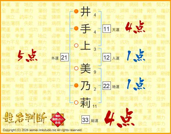 井(4画)手(4画)上(3画) 美(9画)乃(2画)莉(11画)