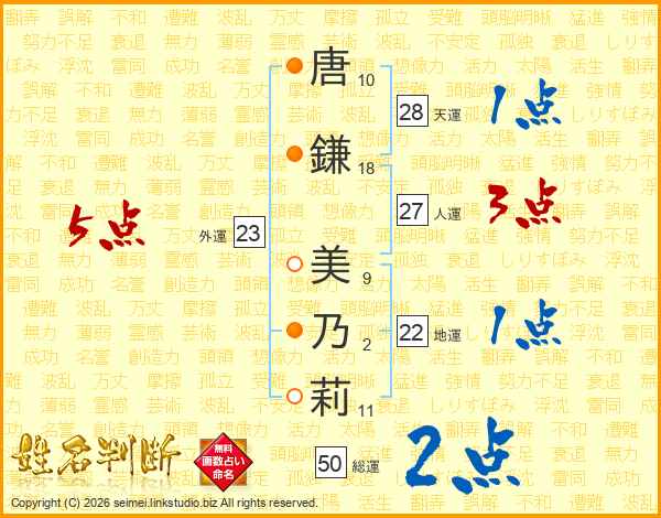 唐(10画)鎌(18画) 美(9画)乃(2画)莉(11画)