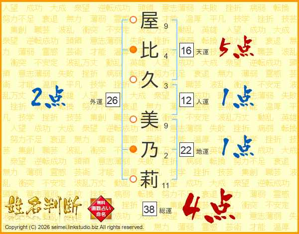 屋(9画)比(4画)久(3画) 美(9画)乃(2画)莉(11画)