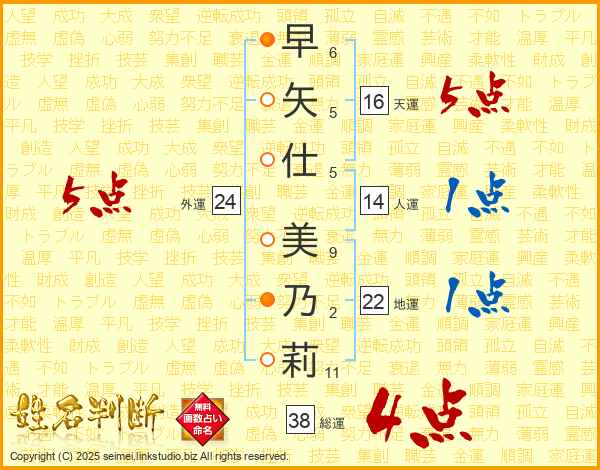 早(6画)矢(5画)仕(5画) 美(9画)乃(2画)莉(11画)