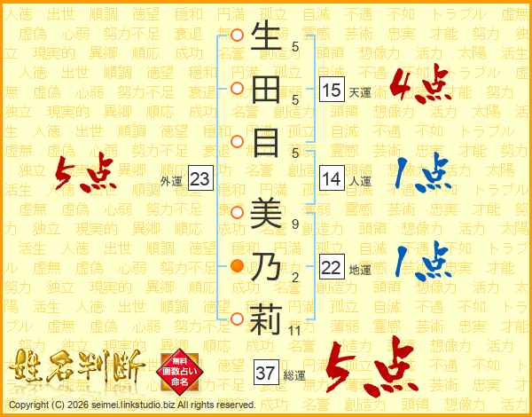 生(5画)田(5画)目(5画) 美(9画)乃(2画)莉(11画)