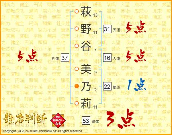 萩野谷美乃莉さんの総運は53画の3点!