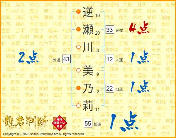 逆(10画)瀬(20画)川(3画) 美(9画)乃(2画)莉(11画)