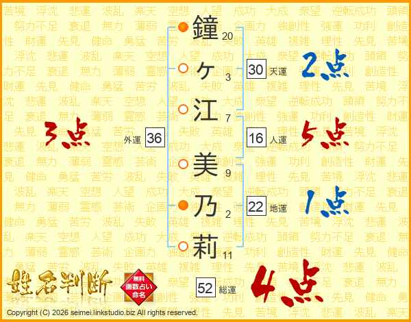 鐘ヶ江美乃莉さんの総運は52画の4点!