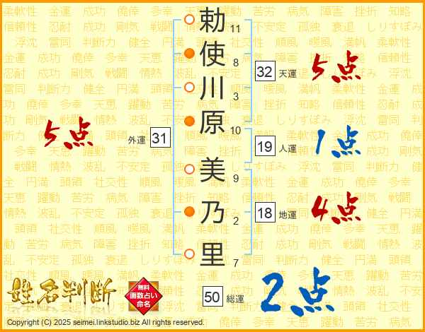 勅(11画)使(8画)川(3画)原(10画) 美(9画)乃(2画)里(7画)