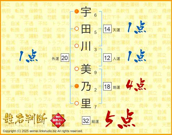 宇(6画)田(5画)川(3画) 美(9画)乃(2画)里(7画)