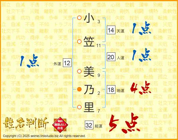 小(3画)笠(11画) 美(9画)乃(2画)里(7画)