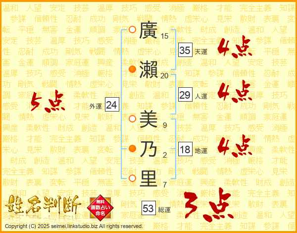 廣(15画)瀨(20画) 美(9画)乃(2画)里(7画)