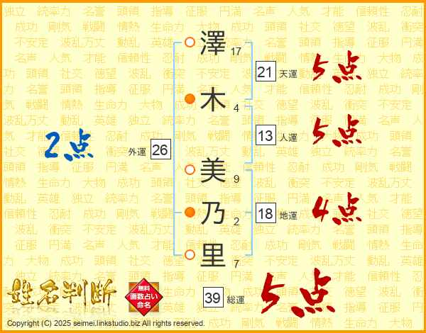 澤(17画)木(4画)  美(9画)乃(2画)里(7画)
