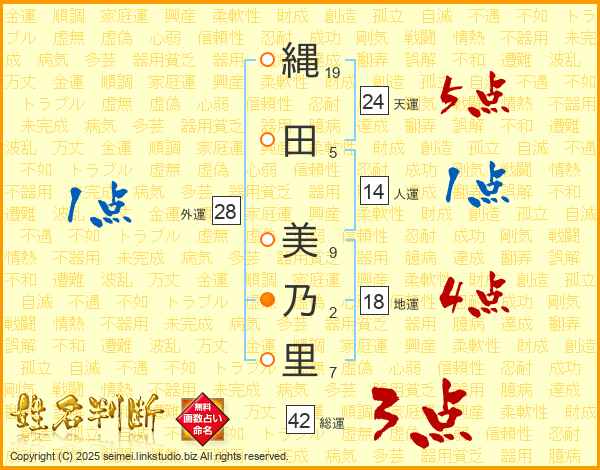 縄(19画)田(5画) 美(9画)乃(2画)里(7画)