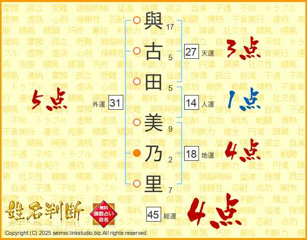 與(17画)古(5画)田(5画) 美(9画)乃(2画)里(7画)