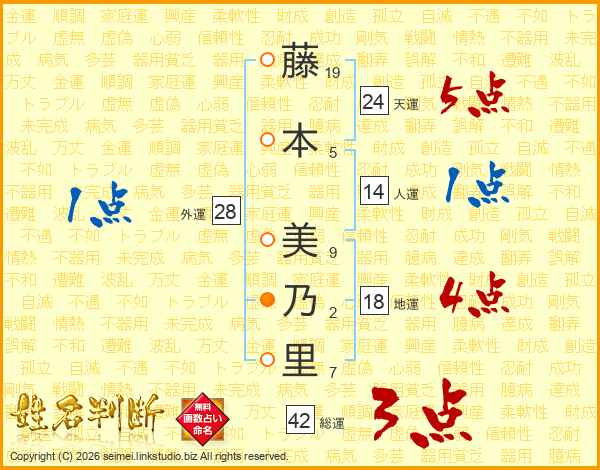 藤(19画)本(5画) 美(9画)乃(2画)里(7画)