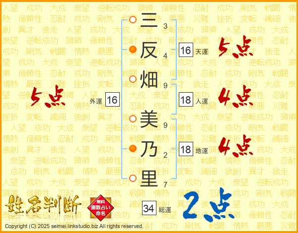 三(3画)反(4画)畑(9画) 美(9画)乃(2画)里(7画)