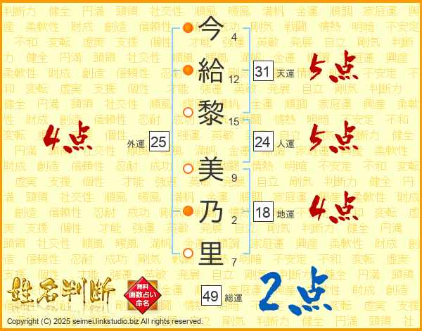 今(4画)給(12画)黎(15画) 美(9画)乃(2画)里(7画)