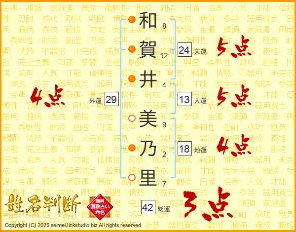 和(8画)賀(12画)井(4画) 美(9画)乃(2画)里(7画)