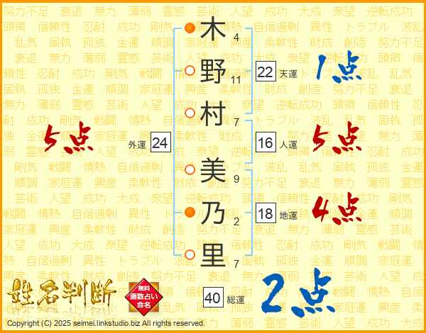 木(4画)野(11画)村(7画) 美(9画)乃(2画)里(7画)