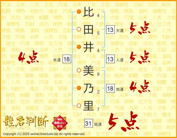 比(4画)田(5画)井(4画) 美(9画)乃(2画)里(7画)