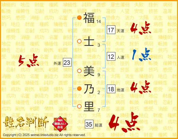 福(14画)士(3画) 美(9画)乃(2画)里(7画)
