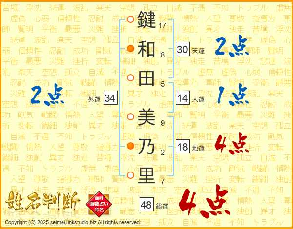 鍵(17画)和(8画)田(5画) 美(9画)乃(2画)里(7画)