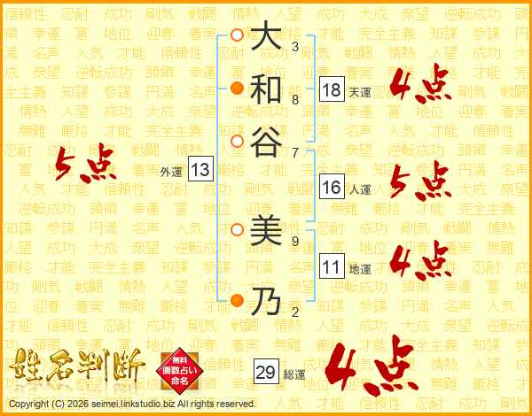 大(3画)和(8画)谷(7画) 美(9画)乃(2画)